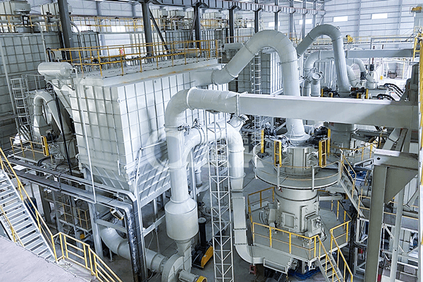物料通過給料裝置被均勻地送至主機磨腔,在離心力和鏟刀作用下,物料在磨輥和磨環之間受到擠壓、研磨而被粉碎,粉碎后的物料在風力的作用下吹向選粉機進行分選,分選后的合格物料經管道進入旋風集粉器收集,未達到細度要求的物料重新回到主機再次研磨。